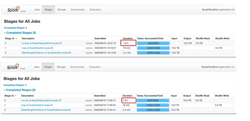 图4中,蓝色部分是Shuffle Service版本的运行时间,橙色部分是原版Shuffle的运行时间。我们测试了2T,4T,10T的数据,可以观察到随着数据量越来越大,Shuffle Service优势就越来越明显。图5红框部分说明了作业的性能提升主要体现在Reduce阶段,可见10T的Reduce Read从1.6小时下降到了1小时。原因前边已经解释的很清楚了,熟悉Spark shuffle机制的同学知道,原版的sort shuffle是M*N次的随机IO,在这个例子中,M是12000,N是8000,而Remote Shuffle就只有N次顺序IO,这个例子中是8000次,所以这是提升性能的根本所在。