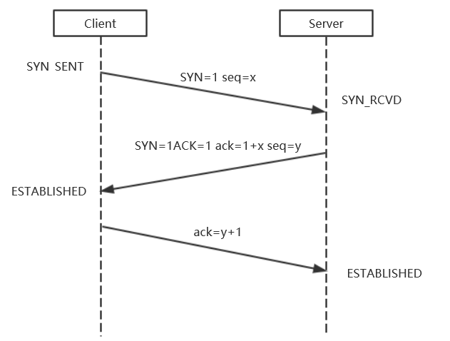 (1)第一次握手:Client将标志位SYN置为1,随机产生一个值seq=x,并将该数据包发送给Server,Client进入SYN_SENT状态,等待Server确认。