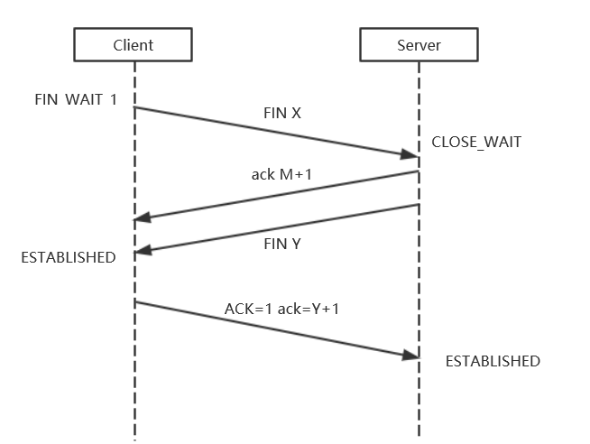 (2)第二次挥手:Server收到FIN后,发送一个ACK给Client,确认序号为收到序号+1(与SYN相同,一个FIN占用一个序号),Server进入CLOSE_WAIT状态。