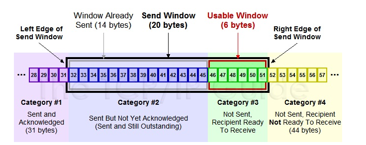 显然,方式1中,一个RTT只能处理一个包,这样的传输效率太低了。而方式2看似很美好,实际会存在两个问题,一个是接收方的接收窗口未必能一次性接收这么多数据,另外一个是网络的带宽也不一定足够大,容易出现丢包事故。前一个问题就是标题中的流量控制(Flow control),TCP采用的是滑动窗口机制(Sliding window),后一个问题就是标题中的拥塞控制(Congestion control)。发送方的发送窗口或者说网络传输交互就取决于这两个问题的控制,谁控制的更严格,谁就占据了决定性因素,这也是为什么两者总是一起出现一起被讨论。