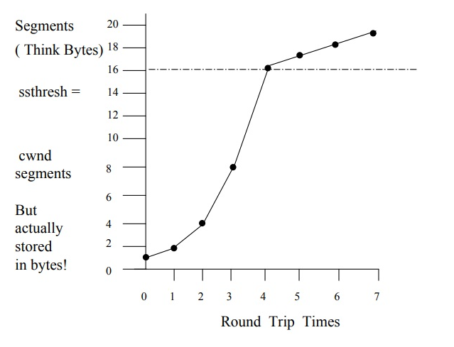 2、 如果发送出去的包都被ACK,说明还未到达拥塞点,则增加拥塞窗口,RFC建议的是每收到n个ACK,则cwnd新增n个MSS,呈指数关系增长,虽然这个过程看似比较快,但是基数比较低,所以被称为“慢启动”。