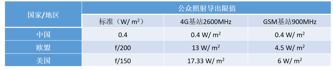 表 2 中,描述的是不同国家地区电磁辐射公众照射导出限值对比。可以看出,我国对电磁环境辐射安全的要求非常严格,其限值显著低于欧盟和美国。