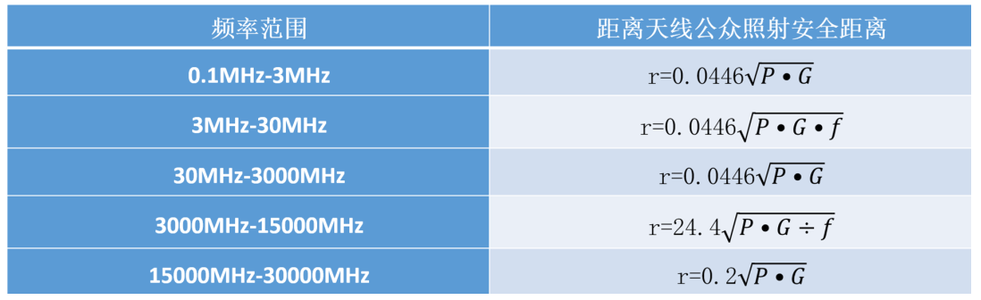 r:距离天线最小的安全距离,单位:mf:频率,单位:MHzP:天线辐射功率,单位:WG:天线最大辐射方向上的增益值