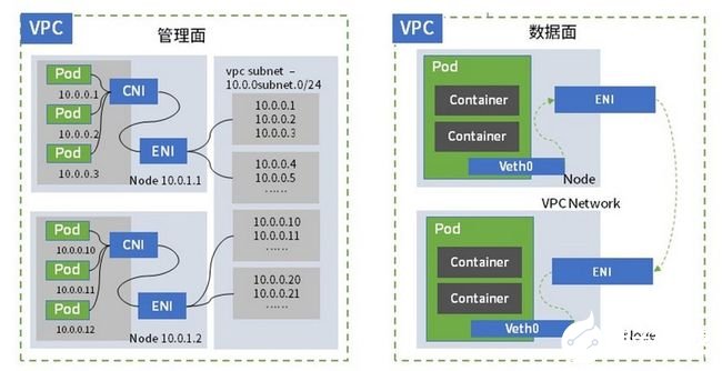 容器与节点在同一网络平面,网段在 VPC 网段内;