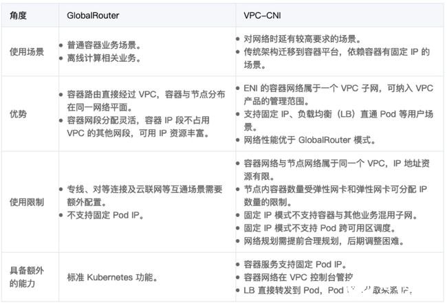 绝大多数情况下应该选择 GlobalRouter,容器网段地址充裕,扩展性强,能适应规模较大的业务;