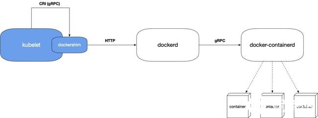 kubelet 内置的 dockershim 模块帮傲娇的 docker 适配了 CRI 接口,然后 kubelet 自己调自己的 dockershim (通过 socket 文件),然后 dockershim 再调 dockerd 接口 (Docker HTTP API),接着 dockerd 还要再调 docker-containerd (gRPC) 来实现容器的创建与销毁等。