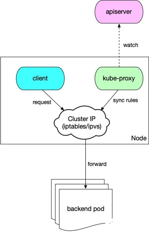 集群内的 client 去访问 Service (Cluster IP),会被 iptable/ipvs 规则负载均衡到 Service 对应的后端 pod。