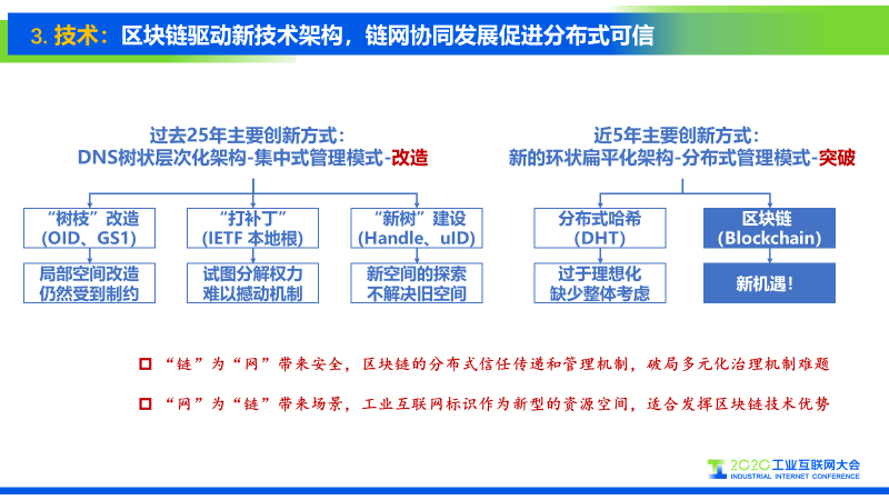 从解析体系自身的技术架构看,过去25年,标识解析体系的主要创新方式是围绕DNS树状结构下的集中管理模式的改造:比如OID体系、GS1体系均是试图在域名空间树上构建新的空间,但局部空间的改造仍然会受到整体树状结构的制约,也出现了一些对本地标识体系的局部设计改造,试图通过打补丁的形式对体系架构进行改进,但这种试图局部分解权利的方式,并不能从根本上撼动整个管理机制;另一类如Handle、UID等标识体系,则试图构建新的寻址空间,但是在新空间中的探索并不能完全解决旧空间中的一些问题。 在过去的5年时间里,出现了很多新的扁平化技术架构,通过分布式的管理架构实现新突破,如分布式哈希网络,但它过于理想化,缺少整体性的考虑。区块链技术则带来了新的机遇,一方面,“链”为“网”带来安全,区块链的分布式信任传递和管理的机制,有助于破局多元化管理机制长期的难题;另一方面,“网”又为“链”带来新的场景,工业互联网标识作为新型资源空间,更加适合发挥区块链技术的优势。