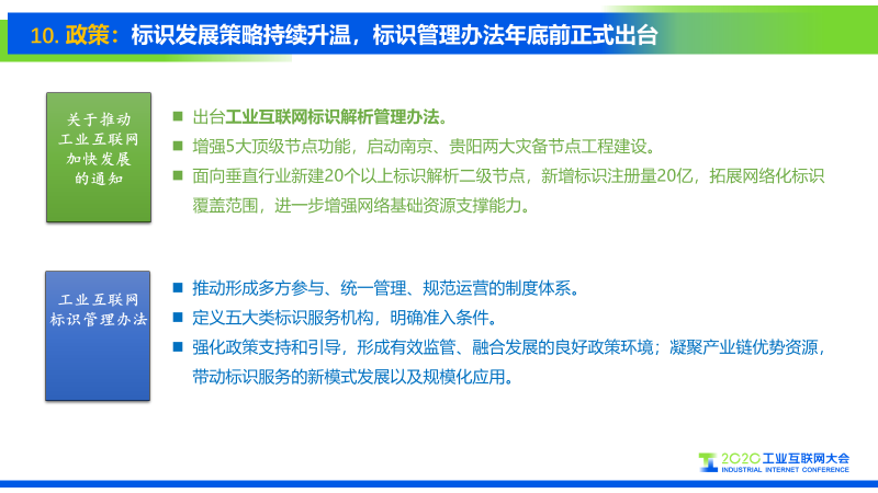 今年3月20日,工信部发布《关于推动工业互联网加快发展的通知》,对工业互联网标识解析的下一步的工作已经做出了提前部署,将继续强化国家顶级节点和二级节点功能,启动南京、贵阳两个灾备节点建设,进一步拓展网络化标识应用的覆盖范围。总的来说,标识发展策略仍将持续升温。 同时,《工业互联网标识管理办法》将于年底前正式出台,通过定义五大类标识服务机构,明确准入的条件,将推动形成多方参与、统一管理、规范运营的标识解析管理体系,为工业互联网标识解析产业生态的健康有序发展提供重要制度保障。