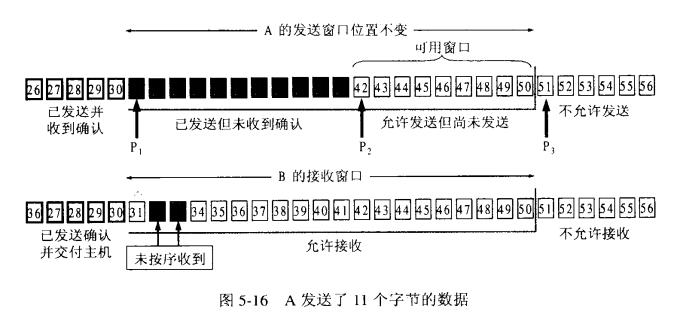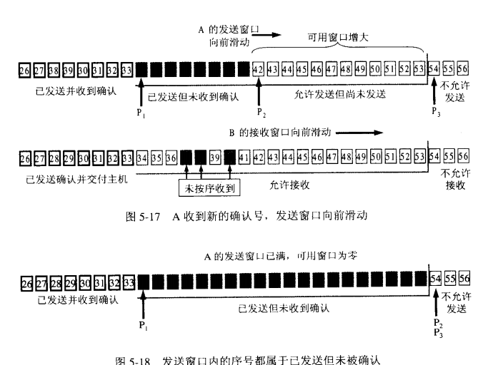 -3. 发送窗口中相关的有四个概念:已发送并收到确认的数据(不再发送窗口和发送缓冲区之内)、已发送但未收到确认的数据(位于发送窗口之中)、允许发送但尚未发送的数据以及发送窗口外发送缓冲区内暂时不允许发送的数据;