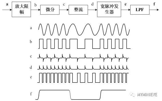 FSK信号经过限幅、微分、整流后形成与频率变化相对应的脉冲序列,由此再形成 相同宽度的矩形脉冲,矩形脉冲的低频分量与数字信号相对应,由滤波器滤出低频分量, 然后经抽样判决,即可得到原始的数字调制信号。