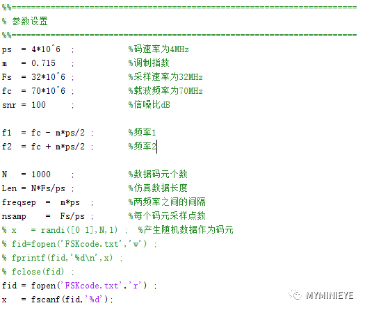 FSK调制信号的参数如下,其中码元速率为4MHz,采样频率为32MHz,载波频率为70MHz,调制指数为0.715。码元为随机产生的数据,需要写入本地,作为后续比对的数据。