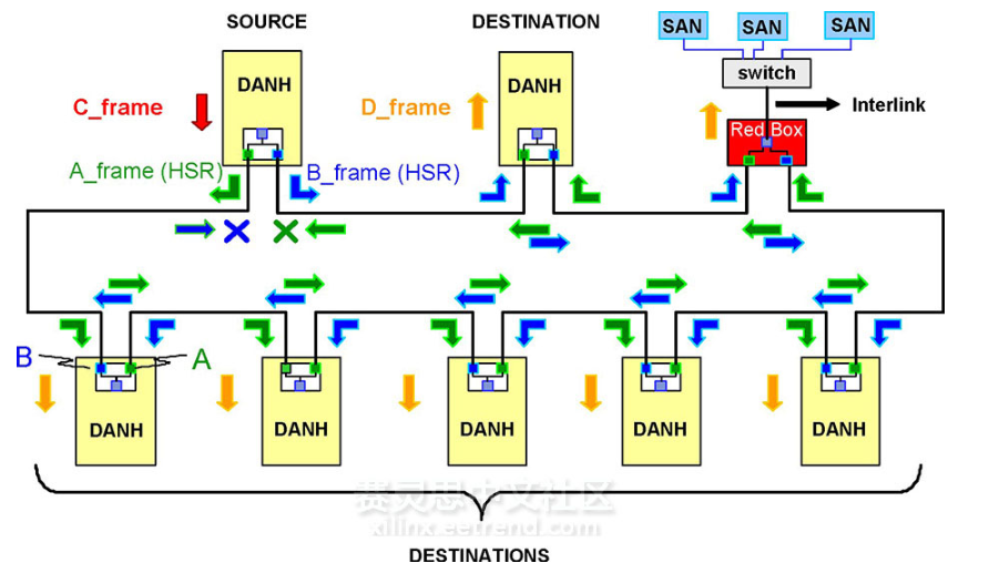不过,如PRP一样,每一个HSR网络节点也有两个以太网端口,并作为一个HSR的双重附加节点连接到网络中。在HSR 环形网络中,数据包需要向两个方向的节点传输,所以,当数据包连续传输到所有目的地时,一旦在网络的任何地方发生单断裂,都可以被探测到。方框图中的红盒子是一个常规的缺乏DANN网络连通性的以太网设备而配置的DANN适配器(对于只有一个以太网端口的设备,PRP协议也支持红盒子思想)。