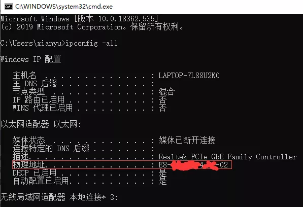 点击电脑 Win + R 键,输入 cmd,再出入 ipconfig -all,按回车键,即可看到自己电脑的 MAC 地址等参数。