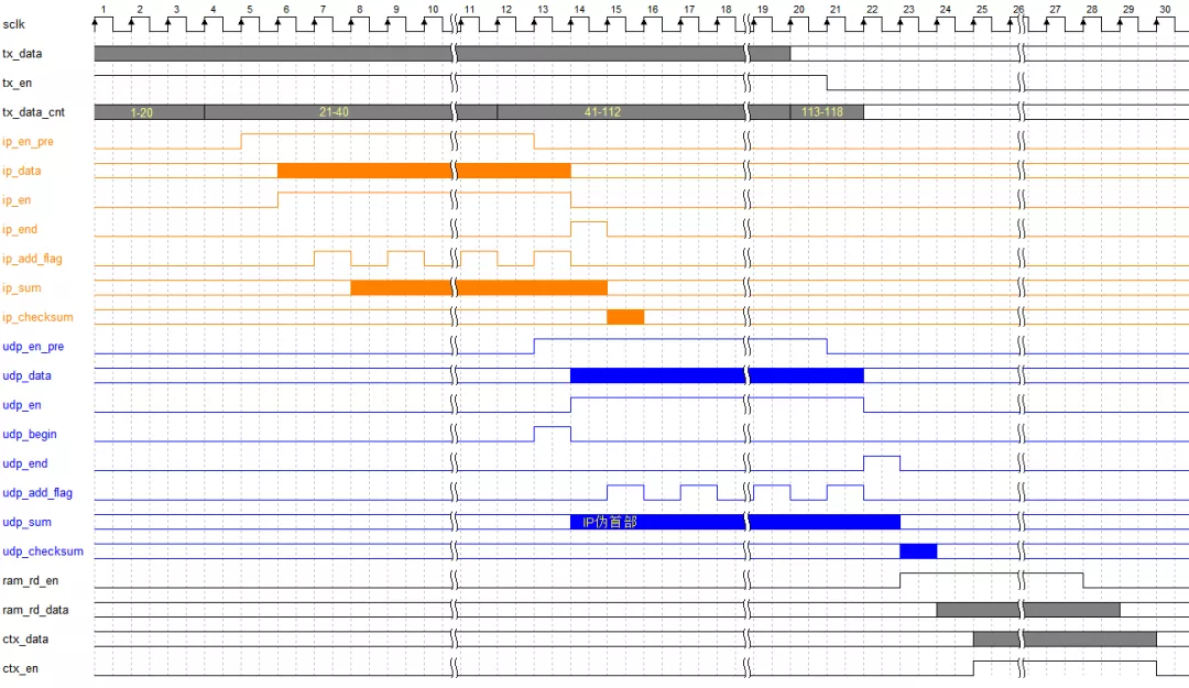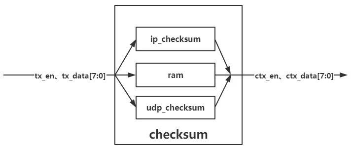 ip_checksum 和 udp_checksum 计算完成,该数据填充的位置已经经过,那么就没办法将数据填充到原来填充 0 的位置了,但我们想要将其组成完整的以太网包,这一步是不可避免的,那么我们该怎么解决呢?我们可以考虑一下,建立一个足够大的 RAM ,在计算 ip_checksum 和 udp_checksum 的同时将前面心跳包数据存储到 RAM 中,当这一包数据全部计算完再将 RAM 中的数据读出。当读出到要填充 ip_checksum 和 udp_checksum 的位置时,将计算出的两个值取反后填充到对应位置即可。