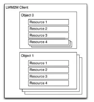 在上述接口中,服务端对客户端进行操作时都需要指定一个具体的操作目标,例如读某个属性,写某个属性。在HTTP协议中,这种目标的指定是通过URI或者消息体内携带的文本消息进行指定。而LWM2M协议为了使通信消息更加简洁,定义了对象和资源的概念。