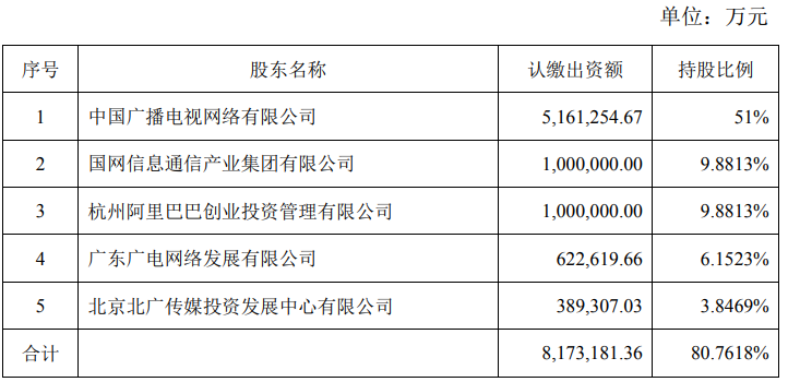 2、五家主要股东:中国广播电视网络有限公司(5G牌照持有者),出资5161254.67万元,占51%股份,国家电网旗下的“国网信息通信产业集团有限公司”和阿里巴巴集团旗下的“杭州阿里巴巴创业投资管理有限公司”,各出资100亿元,占股9.8813%;广东广电网络发展有限公司出资622619.66万元,占股6.1523%;北京北广传媒投资发展中心有限公司出资389307.03 万元,占股3.8469%,前五大股东合计出资817.318136亿元,占股80.7618%。