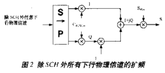 物理信道的扩频由两步组成。第一步是信道化,即将每个数据符号转化为多个码片,以增加信号的带宽。每个数据符号内的码片数被称做扩频因子(SF);第二步为加扰,由此给扩频信号加扰。在下行链路中,两个连续符号组成的符号对经过串并变换,映射到I和Q支路上。映射的结果是偶数号和奇数号的符号分别映射到I和Q支路上。I和Q支路由相同的实值信道化码Cch,SF,m扩频到码片速率,然后将I和Q支路上实值的码片序列变换成复值码片序列。该序列由复值的扰码Sdl,n加扰(复数相乘)。具体的扩频加扰框图(如图2所示)。