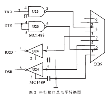 RS-232C串行接口及电平转换电路如图2所示。其中,MC1488、MC1489为电平转换芯片。外部计算机数据通过DB9插座输入后,需经MC1489将RS-232C电平转换为TTL电平,并在89C51的控制下,通过8251存于RAM通信缓冲区中。同样从电台接收来暂存于RAM中的数据要发给外部计算机,亦需经MC1488将TTL电平转换成RS-232C电平。