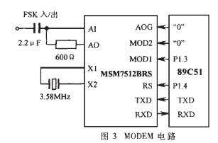 MODEM电路采用OKI公司的FSK MODEM芯片MSM7512B设计而成,其接口输出与TTL电平兼容,且工作模式可由外部逻辑设定。本电路工作状态采用1200bps半双工模式,FSK移频频率符合标准协议ITU-T V.23[2]。在本卡中MODEM应用电路如图3所示。