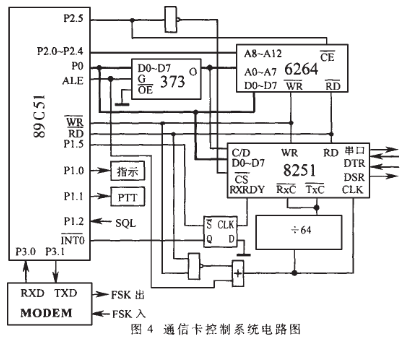 通信卡控制系统电路如图4所示。89C51单片机除完成数据传送控制外,还负责完成电台SQL(静噪信号,也单片机的P1.2相连)信号的检测和电台PTT键控制(由P1.1完成)。