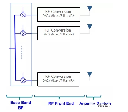 5G要实现20Gbps的峰值速率,主要利用了更大的带宽和更多的数据流。高频段容易获得超过100MHz的连续带宽,并且高频段的天线阵子长度短(波长的一半),有利于在合理尺寸的天线上实现多流空分复用(SDMA)传输,而波束赋形正是该复用方式的最重要的实现技术。在4G阶段,我们使用的智能天线都是采用数字波束赋形技术,该技术能够获得较大的天线增益,并且可以支持多流、多用户的不同传输模式(TM)。数字波束赋形的幅度和相位权值作用于基带(中频)信号,即发射端工作于进入DAC之前,接受端工作于ADC之后。因此,要求天线阵列数与射频(RF)链一一对应,即每条RF链路都需要一套独立的DAC/ADC、混频器、滤波器和功放器。当5G大规模阵列天线需要128个、甚至256个阵列之后,就存在严重的问题——RF链越多需要的尺寸越大、功耗也越大,因此无法满足实际建网的需要。