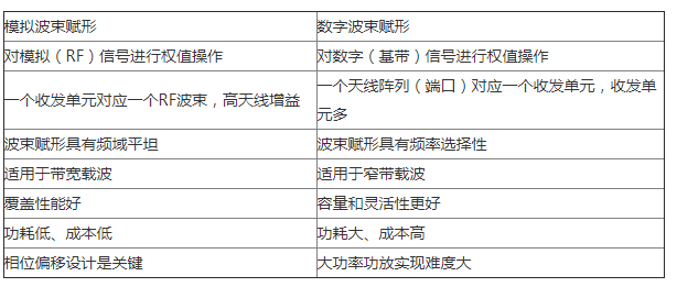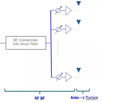 模拟波束赋形技术将幅度和相位权值作用于模拟信号,在发射端,数字信号(RF链)经过DAC之后先由功分器分解为多路模拟信号之后再赋形;在接收端,多个天线阵子的模拟信号先合并(合路器)之后再进入ADC。由于多路模拟信号共用一套DAC/ADC、功分器和混频器,整个系统的功耗就显著下降。同时,功放器和滤波器可以细化到每一个阵列,可以采用小功率,但线性度更好的器件来代替。