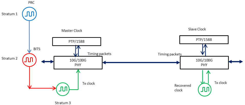 同步以太网是一种采用以太网链路码流恢复时钟的技术, 简称SyncE。同步以太网通过从串行数据码流中恢复出发送端的时钟,从而实现网络时钟同步。但SyncE不能提供时间同步。IEEE1588v2是统一提供时间同步和频率同步的方法,能适合于不同传送平台的时频传送,既可以基于1588v2的时间戳以基于分组的时间传送(TOP)方式单向传递频率,也可使用IEEE1588v2的协议实现时间同步。IEEE1588v2时间同步的核心思想是采用主从时钟方式,对时间信息进行编码,利用网络的对称性和延时测量技术,通过报文消息的双向交互实现主从时间的同步。