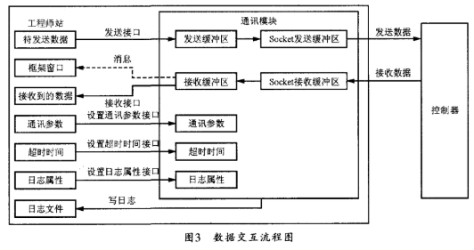 通讯模块主要与框架、在线两个模块以及控制器存在数据交互。图3所示是其通讯模块与组态软件的其它模块及控制器之间进行数据交互的流程图。其中,通讯模块发送给框架窗口的消息主要有三项功能:一是通知在线模块读取控制器返回的应答数据;二是在通讯中出现异常时,返回错误信息;三是在通讯出现超时时,返回超时信息。