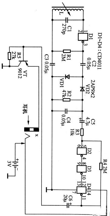 然后,有二极管VD1、VD2等构成的倍压整流检波电路,滤除载波信号,输出调制信号,传递给D2、D3、D4构成的音频放大器,最后经过三极管VT功率放大后,推动耳机发声。