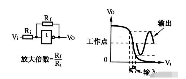 在非门的输出端与输入端之间并联一个反馈电阻Rf,将其工作点,偏置于转换特性曲线的中间点,便构成了一个模拟线性放大器,放大倍数等于反馈电阻Rf与输入电阻Ri的比值。