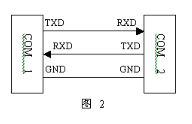目前较为常用的串口有9针串口(DB9)和25针串口(DB25),通信距离较近时(《12m),可以用电缆线直接连接标准RS232端口。若距离较远,需附加调制解调器(MODEM)。最为简单且常用的是三线制接法,即地、接收数据和发送数据三脚相连,只需要如图2进行连接即可。