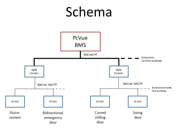其解决方案为PcVue 12.0,它能通过OPC、ICX和BACnet通信协议来连接不同制造商的门锁,并立刻产生强大的抽象层。其创新解决方案通过BACnet/IP来连接GEZE的门系统,因为PcVue软件中含有可用于各种GEZE模块类型的符号和功能块专用库。由于其集成简便,因此现场技术人员可独立进行连接。