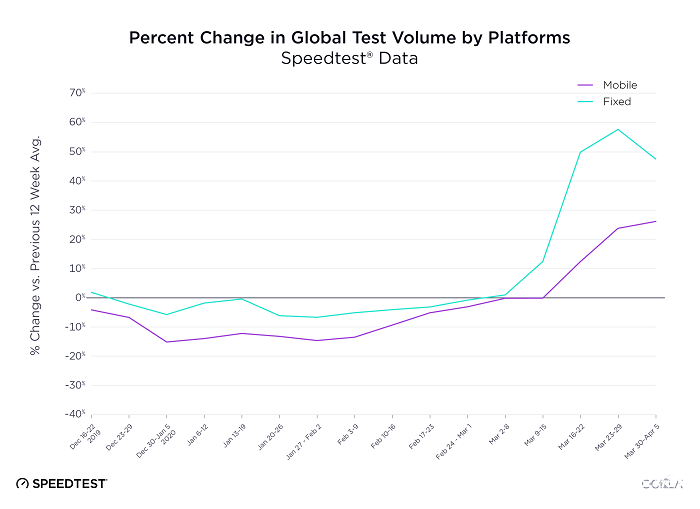 网络测速机构 Ookla 表示,3 月下半月至 4 月第一周,固网宽带速率一直在稳定地下降,但全球范围内的移动宽带速率的变化可以忽略不计。