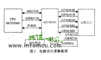 GT-48330的G.Link口的电路设计说明:数据发送和接收线GTXD[15∶0]/GRXD[15∶0]与交换芯片的G.Link口的接收和发送线相连;GTXCMD/GRXCMD发送和接收与交换芯片的接收和发送命令线相连;GTXOCLK发送数据的参考时钟,通过22Ω的匹配电阻接到交换芯片的G.Link口的接收时钟;GRXCLK接收数据的参考时钟,由时钟模块来提供;GTXCLK接收数据的参考时钟,由时钟模块来提供;GTXCLK作为GT-48330的G.Link口的系统时钟,同样由时钟模块来提供。GTXCLK和GRXCLK的时钟频率为83.33 MHz。电路逻辑图如图2所示。