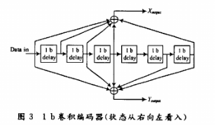 卷积编码我们采用(2,1,7)卷积编码器,其X,Y状态转移多项式为(171,133)。每个时钟周期输入1个bit信息,输出2个bit信息。编码器结构如图3所示。