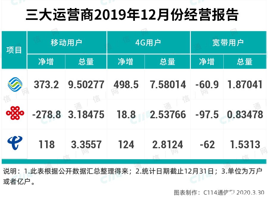 无论是用户规模还是收入规模,中国移动都超过了中国联通与中国电信之和。公开的数据显示,截至2019年12月底中国移动的移动电话用户、4G用户和固网家宽用户分别为9.5亿元、7.6亿户和1.87亿户。