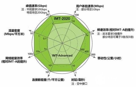 5G是一种全新的网络架构,在4G基础上有质的提升。其一,用户体验速率大幅提升,4G网络为10Mbps,5G网络可以达到100Mbps,部分场景达到1Gbps;其二,连接数密提升一个数量级,4G网络为10万每平方千米,5G网络则可以达到100万每平方千米;其三,相对4G网络,5G端到端时延从10毫秒缩短至1毫秒;其四,用户峰值速度由4G的1Gbps提升至5G的数十Gbps;此外,5G网络在网络能量效率、移动性、频谱效率等方面相对4G也均有大幅提升。