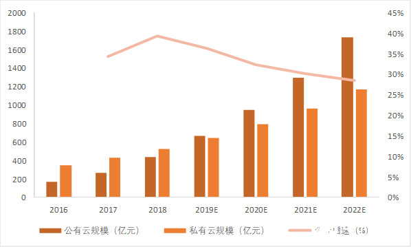 云计算作为IT基础设施已经成为共识,新增的计算、存储等需求催生云计算建设,而传统的IT架构也加速向云计算转型。据中国信通院测算,2018年,我国公有云市场规模达到437亿元,同比增长65.2%,预计2019年-2022年期间,市场规模将处于快速增长阶段,2022年,市场规模有望达到1731亿元;2018年,我国私有云市场规模为525亿元,同比增长23.1%,预计2019年-2022年期间,将保持较快增长,2022年市场规模有望达到1172亿元。2018年我国公有云及私有云市场规模合计达到962.8亿元,同比增长39.2%,增速显著快于全球水平,后续数年都将处于追赶阶段。