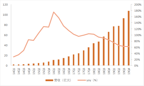 作为国内云计算龙头,阿里云规模持续保持高增长,2019年第四季度,单季度营收规模首次突破100亿元,达到107亿元,同比增长62%。