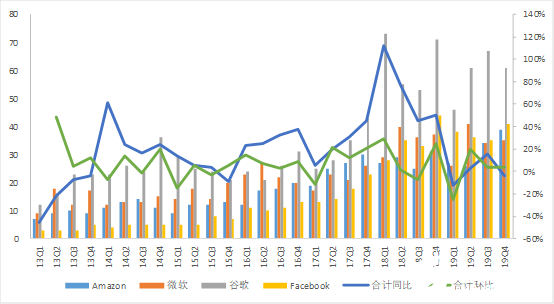 2018年,阿里巴巴用于资本支出达到496亿元,同比增长66%,2019资本支出为417亿元,呈现阶段性放缓。参考美国科技公司节奏及阿里云增长,估计2020年阿里云服务相关资本支出将重回较快增长。其他云计算龙头公司节奏与阿里云类似,设备投入增速也有望进入新一轮快速增长,并对产业链带来明显拉动作用。