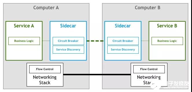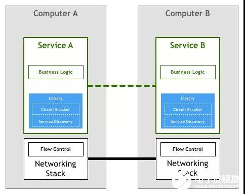 这时,分布式系统特有的通信语义又出现了,如熔断策略、负载均衡、服务发现、认证和授权、quota限制、trace和监控等等,于是服务根据业务需求来实现一部分所需的通信语义。