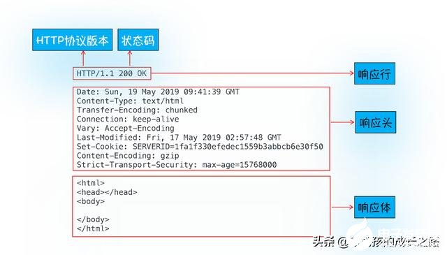 正如浏览器会随同请求发送请求头一样,服务器也会随同响应向浏览器发送响应头。响应头包含了服务器自身的一些信息, 比如服务器生成返回数据的时间、返回的数据类型(JSON、HTML、流媒体等类型),以及服务器要在客户端保存的 Cookie 等信息。
