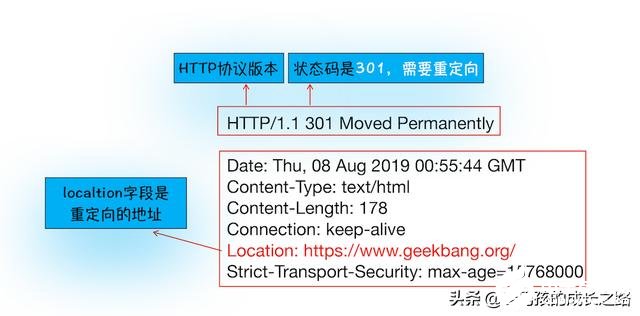 状态 301 就是告诉浏览器,我需要重定向到另外一个网址,而需要重定向的网址正是包含在响应头的 Location 字段中,接下来,浏览器获取 Location 字段中的地址,并使用该地址重新导航,这就是一个完整重定向的执行流程。
