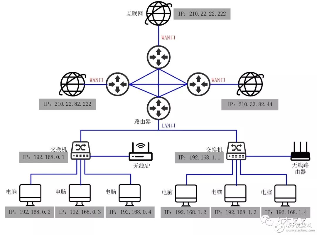 路由器:连接广域网使用,接收到LAN口的数据,转发给WAN口,然后根据路由表来选择路径进行转发。