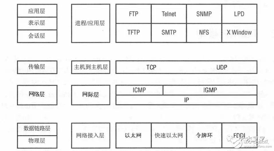 TCP/IP是一个由许多单独协议组成的开放的协议栈,TCP/IP四层协议分别是指:应用层、传输层(也称,主机到主机层)、网际层和网络接入层,各层的协议如图2.所示。