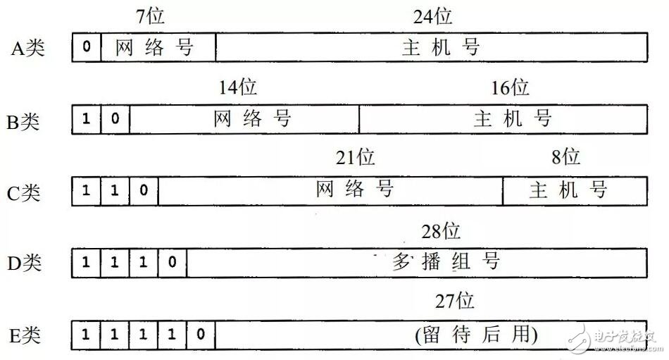 IP地址等于网络地址加上主机地址,网络地址表示其属于互联网的哪一个网络,主机地址表示其属于该网络中的哪一台主机。二者是主从关系。IP被分为A、B、C、D、E五类,如表所示。其中D类子网被用于多播,E类子网被保留将来使用。IP地址由四段组成,每段一个字节八位。