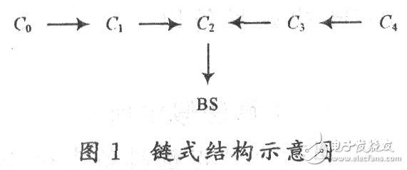当节点链形成并且选举出领导节点后,就开始了数据传输过程。PEGASIS中的数据传输使用Token(令牌)机制,如图1所示。Token很小,故能耗较少。在一轮通信中,领导节点用Token控制数据从链尾开始传输。图中,C2为领导节点,将Token沿着链传给C0,Co传数据给C1,C1将C0数据和自身数据进行融合后形成一个相同长度的数据包,再传给C2。然后,C2将Token传给C4,C2以相同的方式接收来自C3,C4的数据。这些数据在C2处进行融合后,发给基站。
