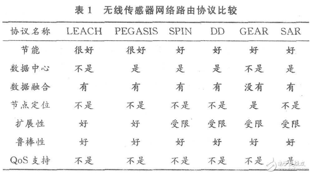节能是无线传感器网络最重要的特征,因而高效地利用能量是无限传感器网络路由协议设计的根本出发点。LEACH和PEGASIS具备很好的节能策略,SPIN,DD,GEAR,SAR也分别具备相应的节能策略。但是,无线传感器网络与应用高度相关,所以路由协议在节能的前提下还要满足以下方面的性能要求:以数据为中心、支持数据融合、基于节点定位、具有可扩展性、鲁棒性、提供QoS支持等。依据上述性能指标,对描述的路由协议特点进行对比的结果如表1所示。