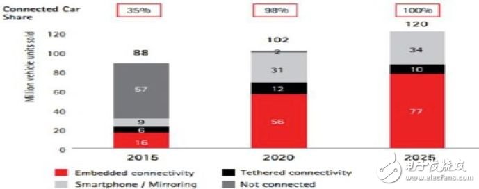 2015年全球新车销售约为8800万辆,其中35%的汽车通过嵌入式移动通信系统、 内置Tethered 系统、智能手机等方式实现联网。预计到2020年,全球联网汽车销 售量将占新车销售的98%,预计到2025年全球销售的新车均实现联网。连接方式上,通过嵌入式移动通信模块进行互联的汽车占据主要份额,2025年销 售量将达到7700万辆,占比64%,而通过智能手机实现互联的汽车占比为28%。